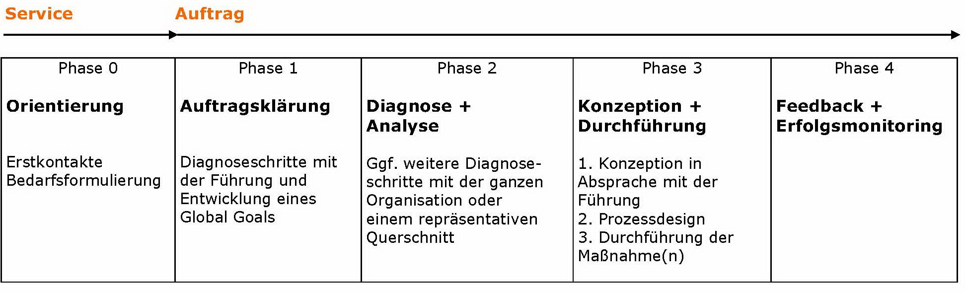 In vier Phasen gehen wir bei der Ermittlung und Durchführung eines Auftrags vor. In allen Phasen entlasten wir Führungskräfte durch Moderation und Prozess-Steuerung, damit sie sich auf ihre Führungsaufgaben konzentrieren können.